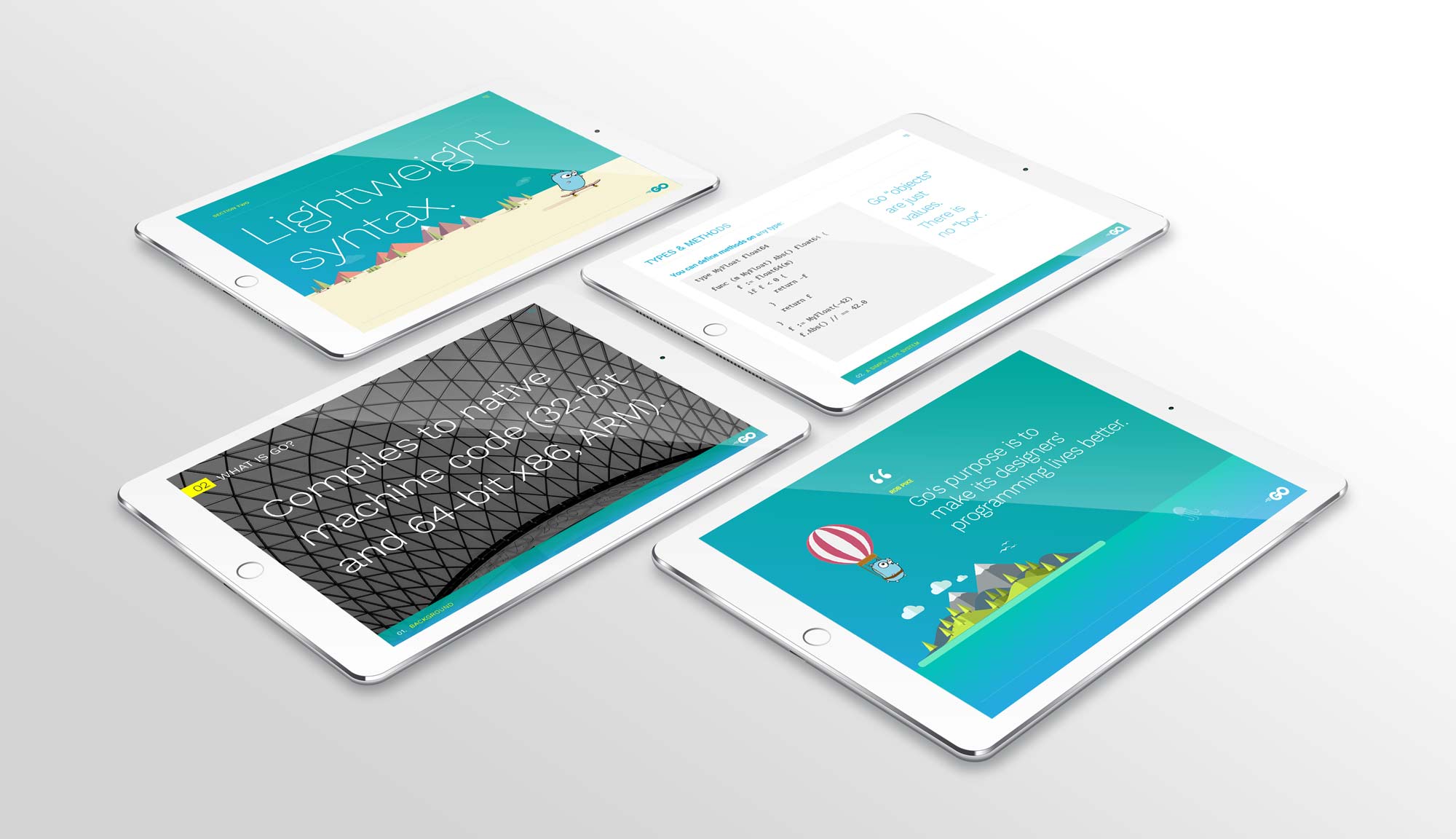 In addition to our brand guide we have also developed a presentation theme. This presentation theme will enable us to have a consistent representation of Go in person at meetups and conferences as well as online. Go community members are welcome to use this theme for their own presentations.